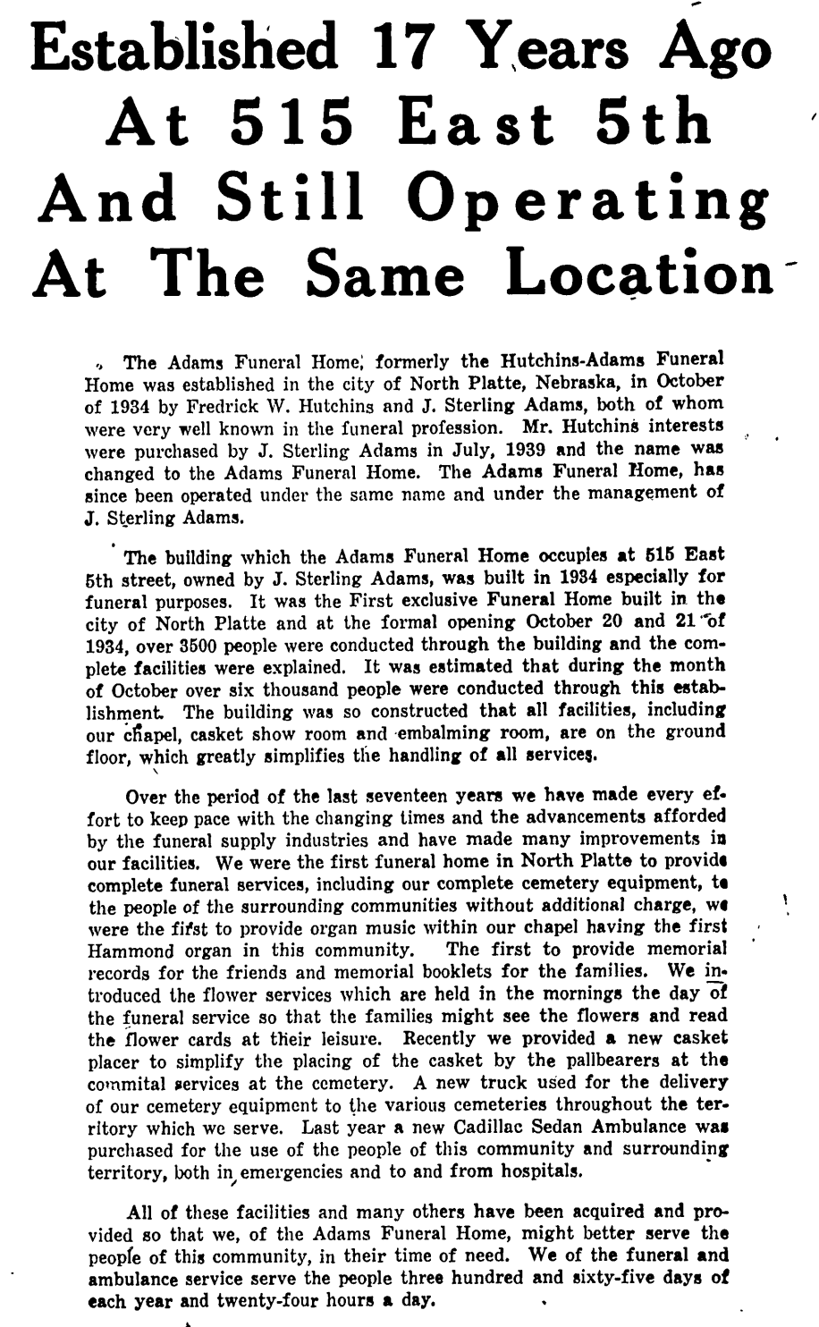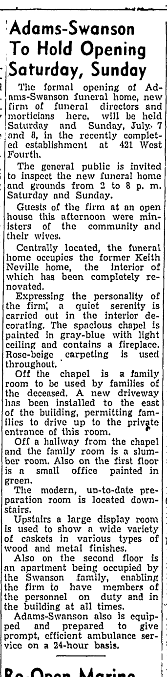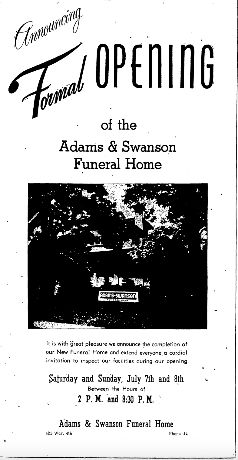 Built in 1912 by Edward R. Goodman, the house at 421 West 4th Street was purchased by Keith Neville and wife, Mary, in 1923- Keith being the governor of Nebraska from 1917 to 1919. The couple occupied the home until it was purchased by Bill Adams and Kenneth Swanson in the early 1950s and was then renovated to function as a funeral home and ambulance service, formally opening on July 7, 1951. From the very first funeral call on opening day to present time, the people working within have always striven to provide compassion and guidance to families locally and in the surrounding area.